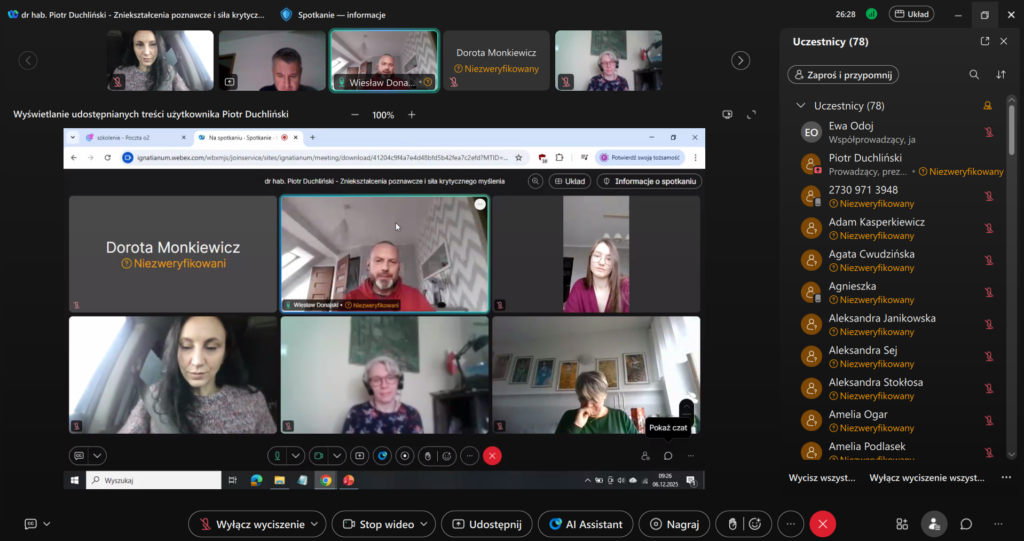 6.12.2025 odbyło się szkolenie online z prof. Piotrem Duchlińskim “Zniekształcenia poznawcze i rola krytycznego myślenia w ich restrukturyzacji”. Szkolenie realizowane było w ramach projektu „Krytyczne myślenie, kultura logiczna i edukacja filozoficzno-etyczna jako wyzwania współczesności”, finansowanego ze środków budżetu państwa, przyznanych przez Ministra Edukacji i Nauki w ramach programu „Nauka dla Społeczeństwa II” (nr umowy: NdS-II/SN/0415/2024/01).