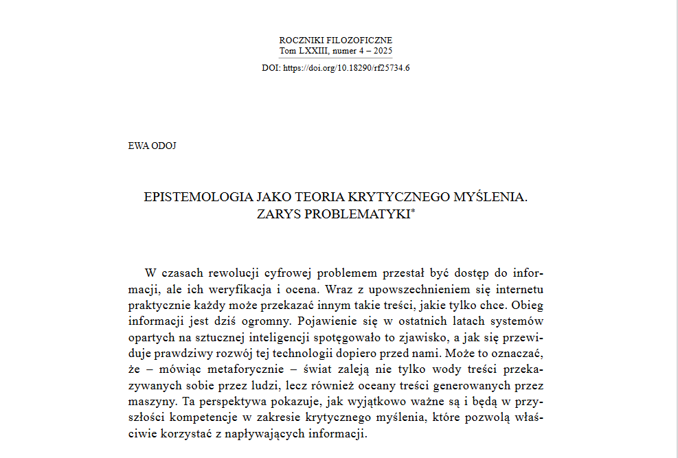Ukazał się artykuł dr Ewy Odoj pt. “Epistemologia jako teoria krytycznego myślenia. Zarys problematyki” (Roczniki Filozoficzne 2025, vol. 73(4) ). Link: https://czasopisma.tnkul.pl/index.php/rf/issue/view/120 W artykule Autorka zwraca uwagę na istotną rolę krytycznego myślenia we współczesnym świecie oraz podkreśla, że do pełnego zrozumienia tej kompetencji potrzeba namysłu filozoficznego. Jej zdaniem problemy analizowane przez epistemologów pozwalają zrozumieć, czym […]