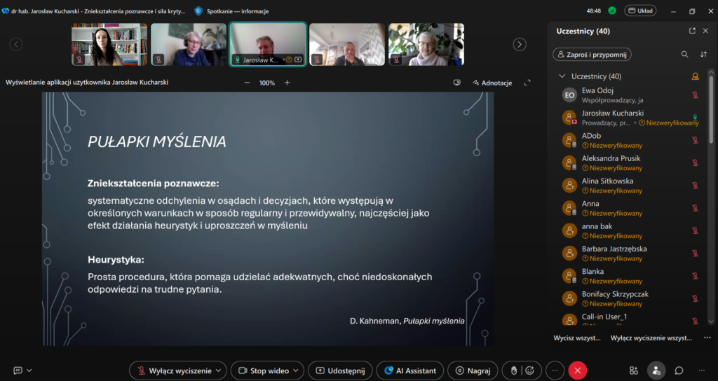 10.01.2026 odbyło się szkolenie z dr hab. Jarosławem Kucharskim pt. “Zniekształcenia poznawcze i rola krytycznego myślenia w ich restrukturyzacji”. 40 osób dyskutowało o tym, czym są zniekształcenia poznawcze, skąd się biorą i jak się przed nimi chronić. Kiedy powinniśmy się ich wystrzegać, a kiedy cieszyć się ich działaniem? Jak zniekształcenia poznawcze komplikują proces grupowy i […]