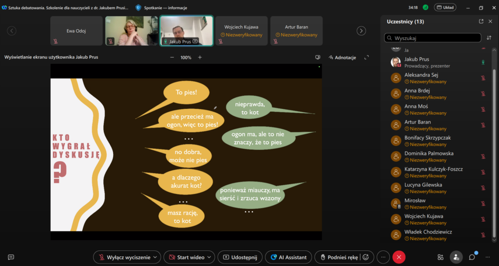 14.01.2026 odbyło się szkolenie z dr Jakubem Prusiem na temat kooperacyjnego modelu debatowania. W debacie krakoskiej liczy się zysk poznawczy obu stron, a nie pokonanie (za wszelką cenę) przeciwnika. Współpraraca, a nie współzawodnictwo! Szkolenie realizowane jest w ramach projektu „Krytyczne myślenie, kultura logiczna i edukacja filozoficzno-etyczna jako wyzwania współczesności”, finansowanego ze środków budżetu państwa, przyznanych […]